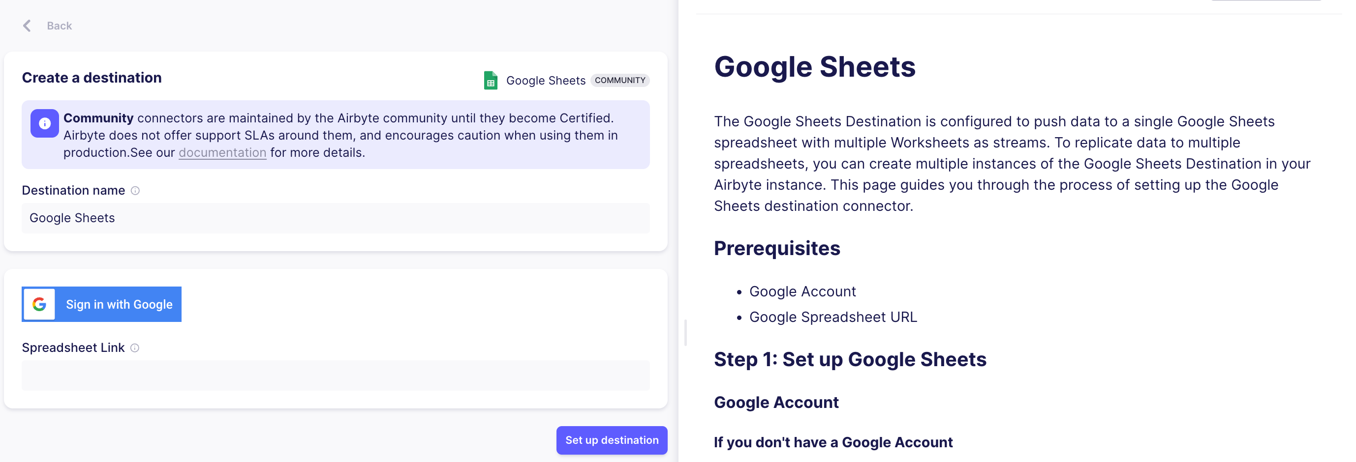 Authenticate into your Google account by clicking "Sign in with Google" and granting permissions to Airbyte. Because this is a simple Google Sheets destination, there is only one more required field, Spreadsheet Link. This is the path to your spreadsheet that can be copied directly from your browser.